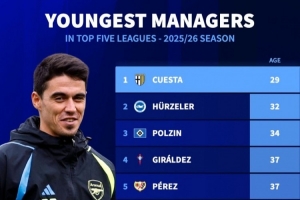 德转列25-26赛季五大联赛球队主帅年龄(从最年轻起排列):